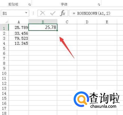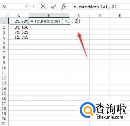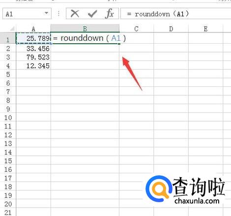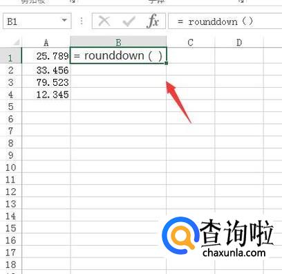使用excel打开我们的文件,然后选择单元格,并在单元格内输入“= rounddown()”函数,如图所示: