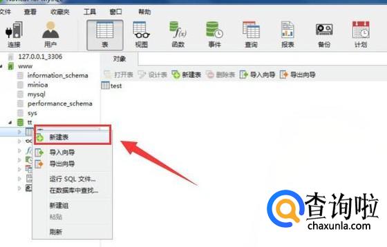 双击打开MySQL软件,在左侧中找到【表】并且右击选择【新建表】,如下图所示:
