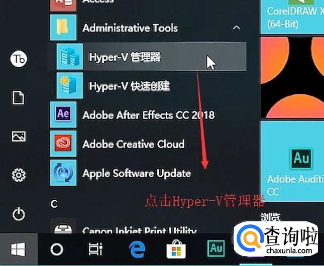 重新启动以后我们在开始菜单中点击Hyper-V管理器,如下图所示