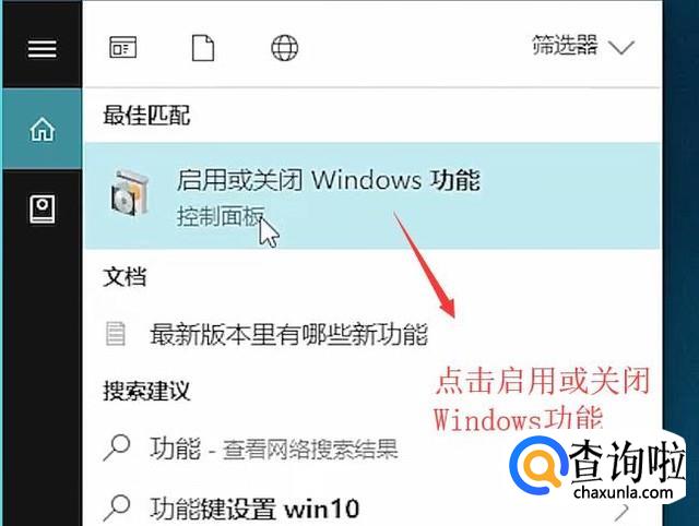 首先在开始菜单中点击启用或关闭Windows功能选项,如下图所示