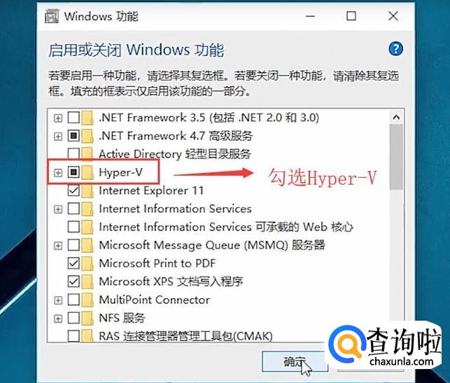 接下来在弹出的Windows功能界面中勾选Hyper-V复选框并点击确定