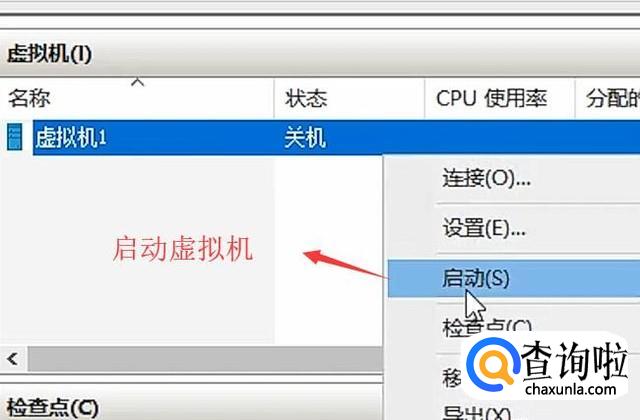 最后安装好虚拟机以后我们进入Hyper-V管理界面,右键单击虚拟机,选择启动选项即可,如下图所示