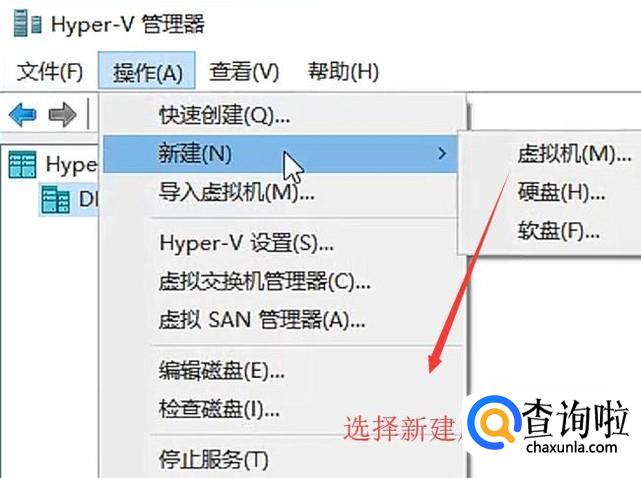 进入Hyper-V管理器以后点击操作菜单,选择新建下面的虚拟机选项,如下图所示