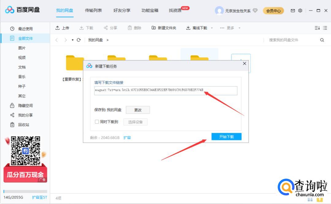 接着会弹出一个任务框,我们把刚才复制好的磁力链接粘贴到框里,点击下方蓝色按键。