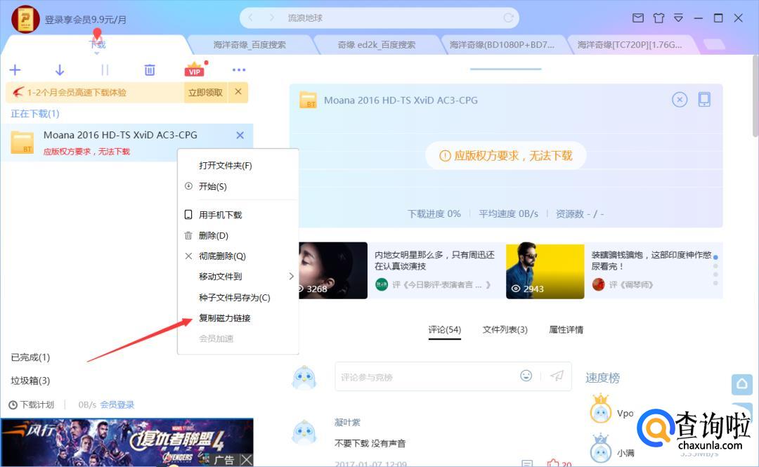 我们首先打开迅雷,找到自己无法正常下载的文件,右键点击文件选择复制磁力链接。