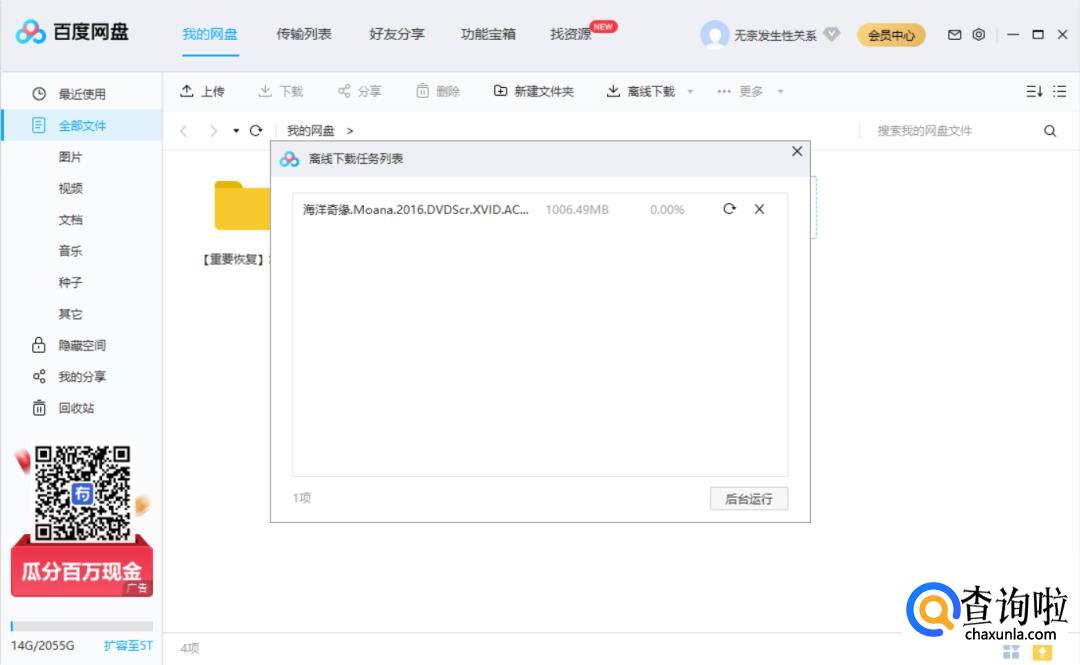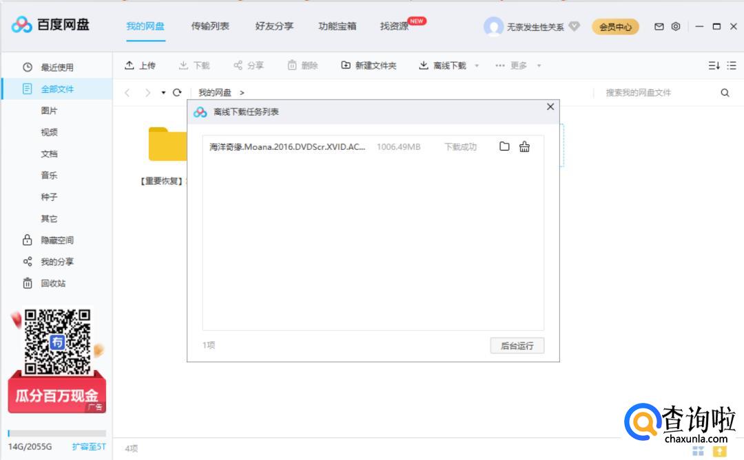 然后我们可以看到我们想要的资源已经在下载了,等到下载完成后,我们就可以直接在网盘中看到这个资源,右键资源选择【在线播放】就可以看了。