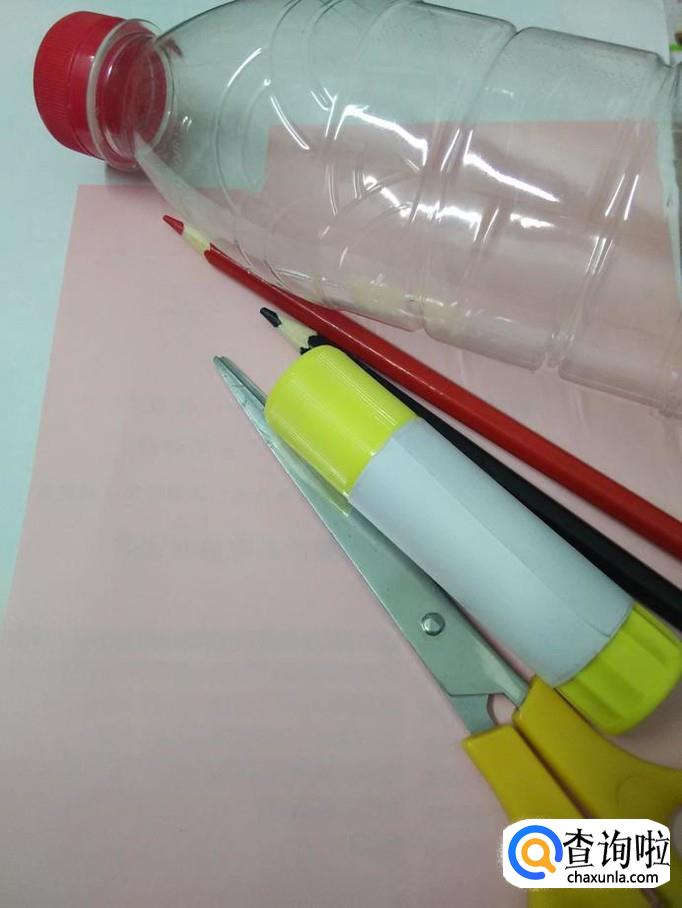 先把塑料瓶、彩纸、彩笔、剪刀和胶棒准备好。