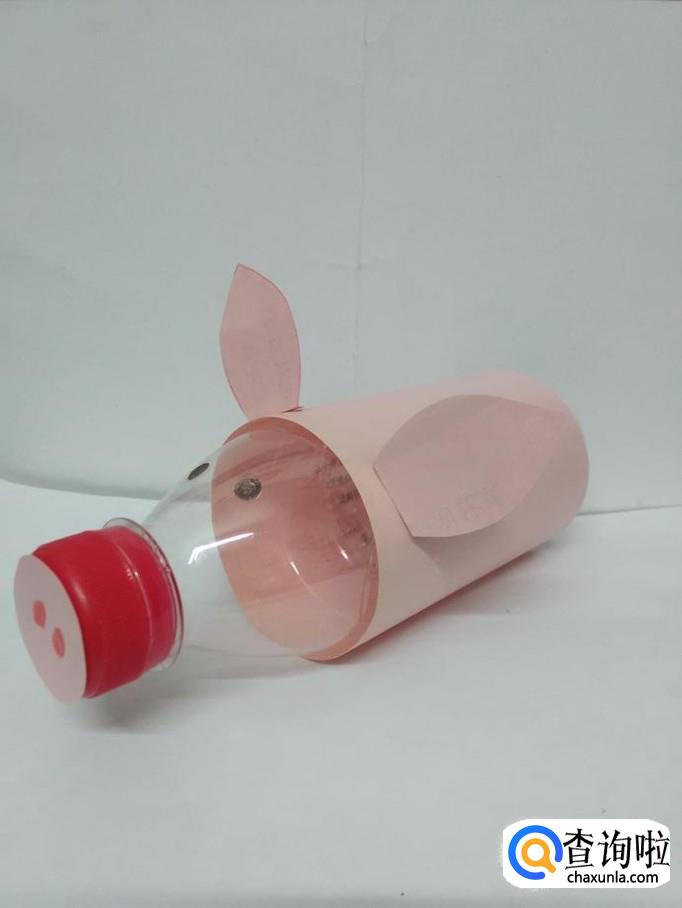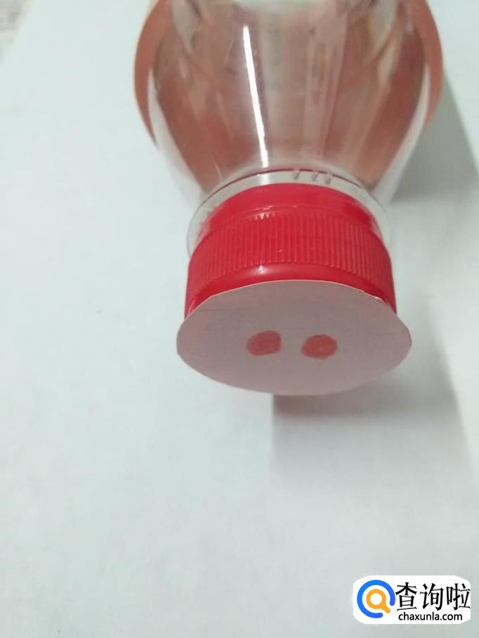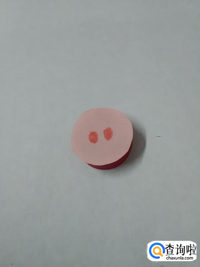 用红笔在圆形中间画两个椭圆形,表示小猪的鼻孔,在圆形背面抹上胶棒,粘在瓶盖上,再把瓶盖拧在瓶子上。