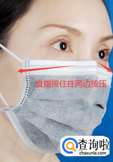 两手指在鼻子两侧轻轻按压金属条;再将口罩下端拉至下颚,调整至与脸间无隙为好。