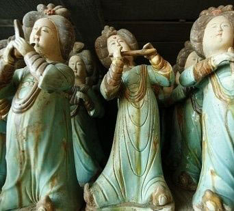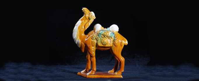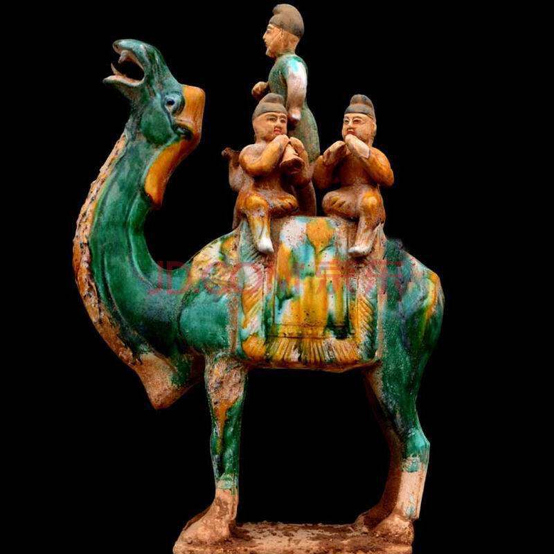 批唐代墓葬,发现了为数众多的唐三彩随葬品。常见的出土唐三彩陶器有三彩马、骆驼、仕女、乐伎俑、枕头等。尤其是三彩骆驼,背载丝绸或驮着乐队,仰首嘶鸣,那赤髯碧眼的骆俑,身穿窄袖衫,头戴翻檐帽,再现了中亚胡人的生活形象,使人联想起当年骆驼行走于“丝绸之路”上的景象。
