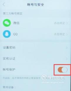在 帐号与安全 中,点击关闭 帐号保护 这个按钮