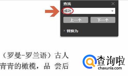 在查找中输入我们要查找的文字内容,比如“成功”,按下回车键系统就开始内容查找了;