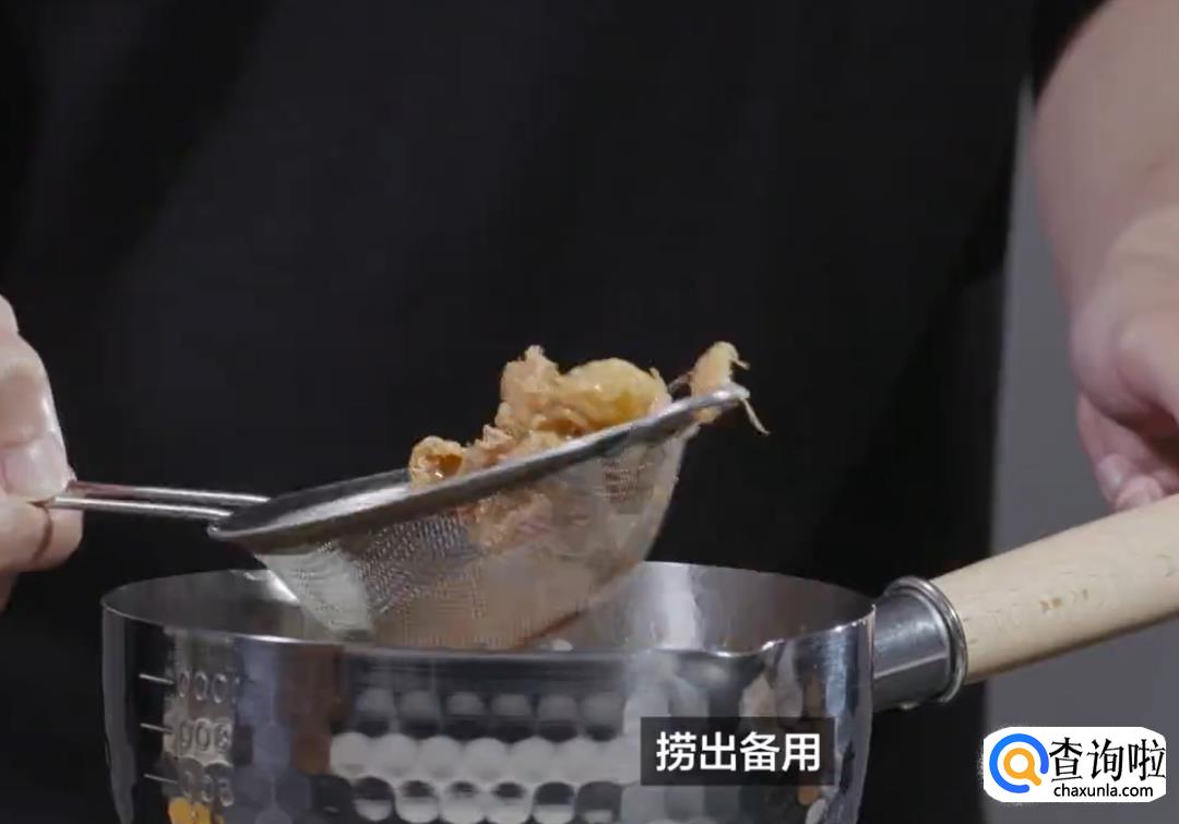 先炸蛋酥,猪油下锅大火融化后,蛋液用漏勺滴入热油。