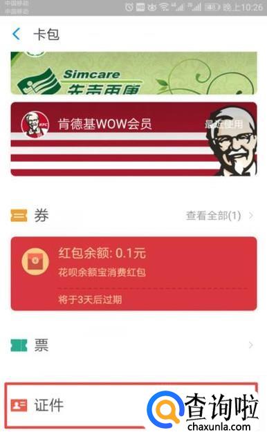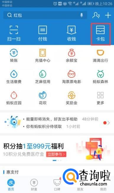首先,我们进入我们的支付宝,然后我们点击卡包;