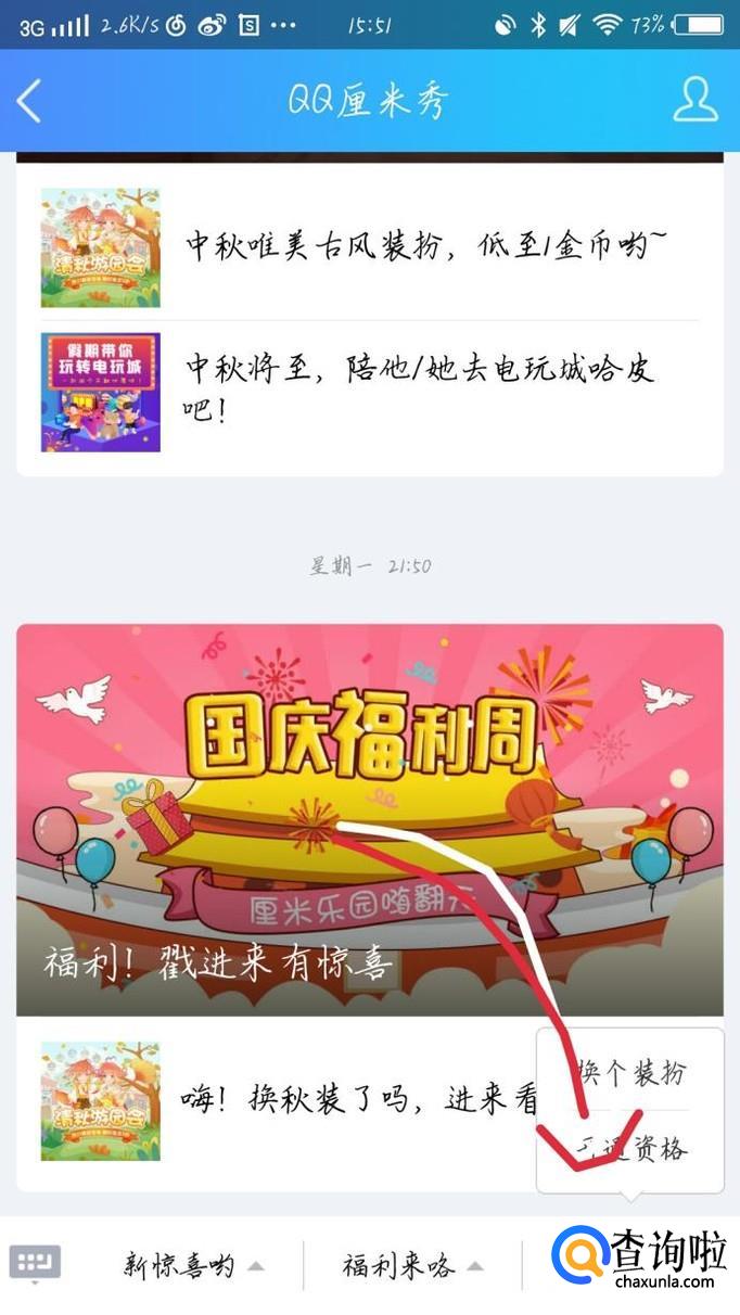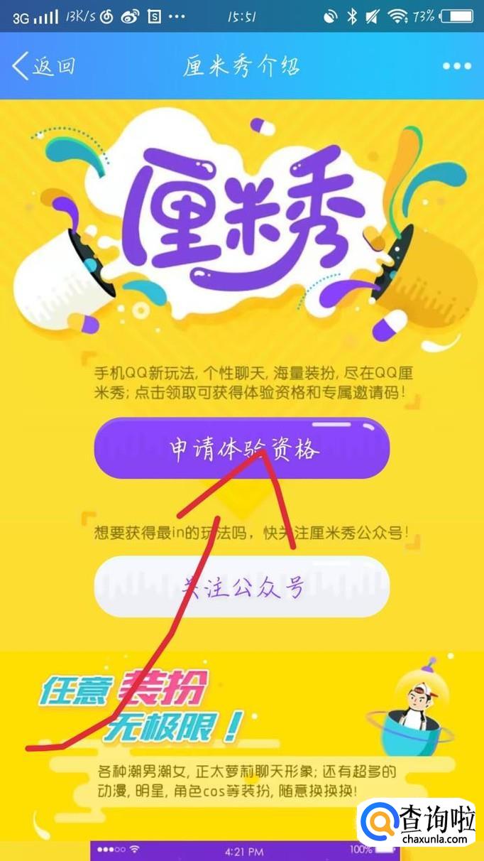 点击“开通资格”选项,如图1箭头所示。会出现一个新的界面,点击“申请资格”选项,如图2箭头所示。在新的界面,点击“开启厘米秀”选项,就可以了。