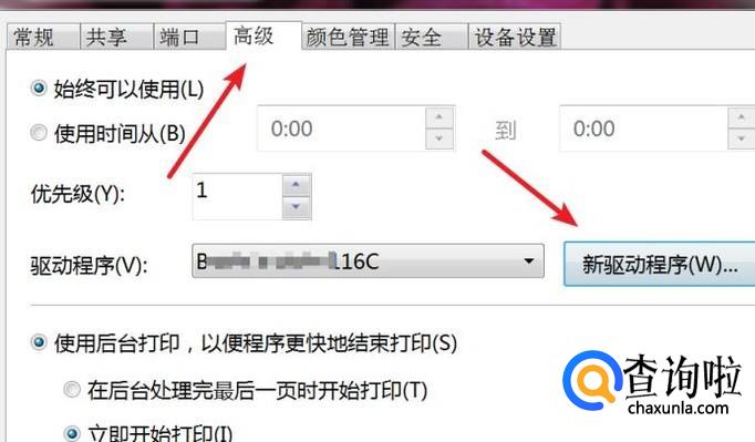 打开属性窗口,在高级选项下,点击‘新驱动程序’