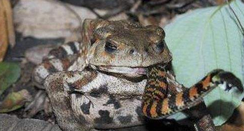 牛蛙吃蛇虽不常见,但也不是罕见的新闻。因为牛蛙个儿大、性情较凶猛,加上栖息地常有水蛇出没,所以吞食小本蛇并不怎么困难。不过它也有“自知之明”,绝不会去冒犯个儿很大的蛇。