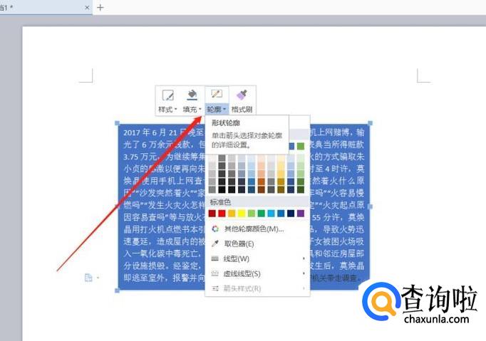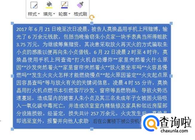 在上图中我们可以看到文本框设置的几个选项。样式、填充、轮廓和格式刷。按照您的需求来设定。比如您需要蓝色的文本框,就可以选择蓝色。设置完效果如下面第二个图。