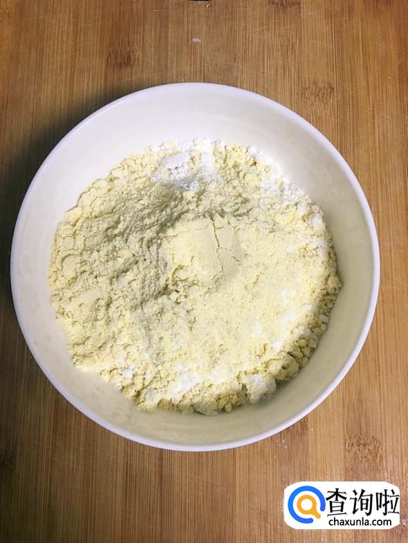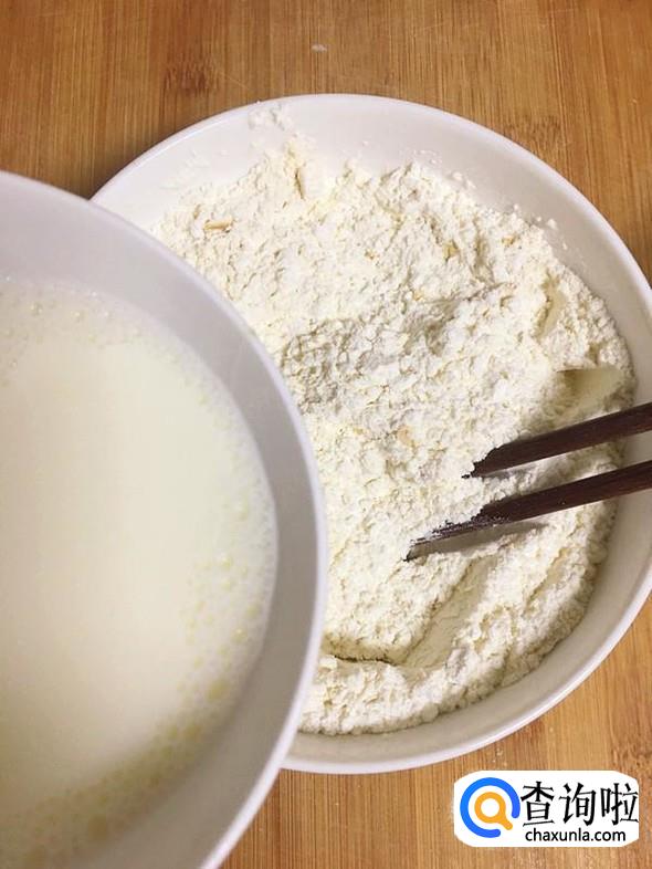 牛奶中加入1小勺白糖,搅拌至融化,逐渐倒入面粉中,搅拌至雪花状。