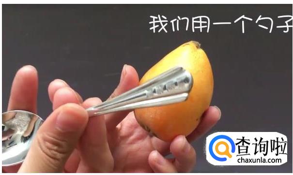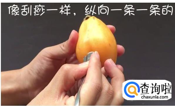 如果枇杷皮不好撕掉的话,可以用一个勺子的头部,像刮痧一样,纵向一条一条的将枇杷上下刮,一定要顺着一个方向刮,力度也不要太大了,刮满一圈后,我们就能很轻松的剥开枇杷皮了。