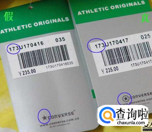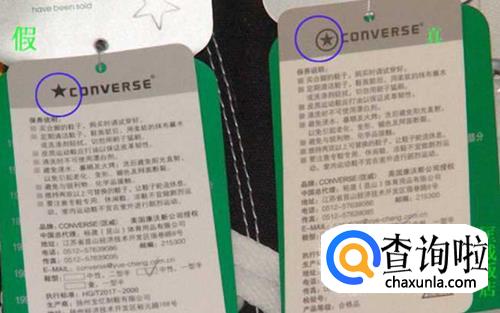 吊牌的制作和设计上,匡威也做到了精心细致。因为隔一段时间匡威都会换吊牌的材质,所以就不详细的介绍材质的问题了,我们就拿前三位是173的货号来说。正品的吊牌在挂链子的金属孔有一个铁环,而且在商标上的小星星上加了个小圈。假货的吊牌有时则看不见铁环,而且在小星星上也没有圆圈的标记。如果细心观察就会发现。在用手摸吊牌时,还有一个区别就是,正品的要比假货的厚一些。