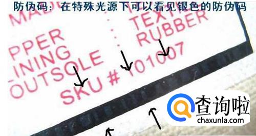 这个很好辨认,把鞋标上的黑框对准光源,通过反光我们可以看见里面有与其他颜色有差异的黑杠。一般的仿冒品几乎都没有,但是现在的高仿鞋也会有这样的技术,所以在区分时不要简单的只看这一点。