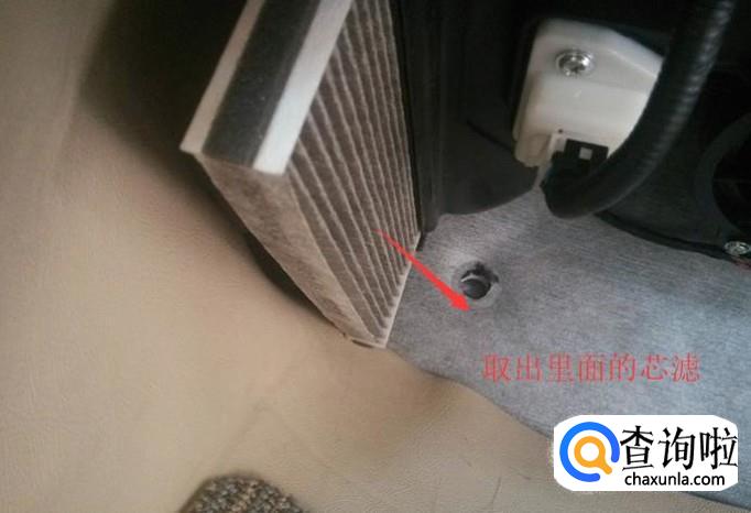 接下从卡槽内我们取出里面旧的空调滤芯,如下图所示,直接往外面拖拽即可