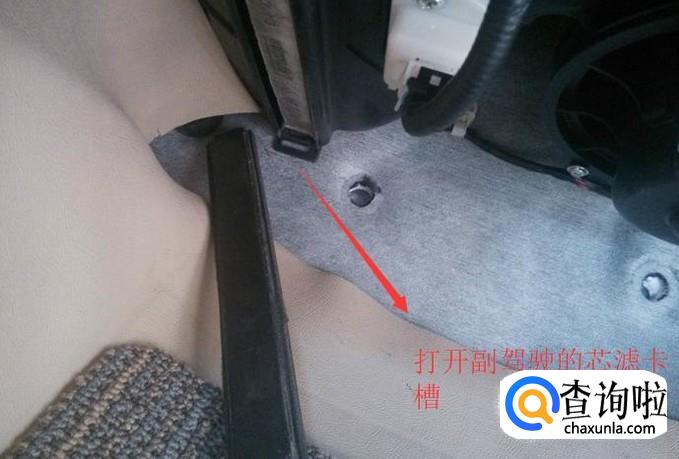 首先我们到副驾驶中找到空调滤芯的卡槽,我们打开卡槽,如下图所示