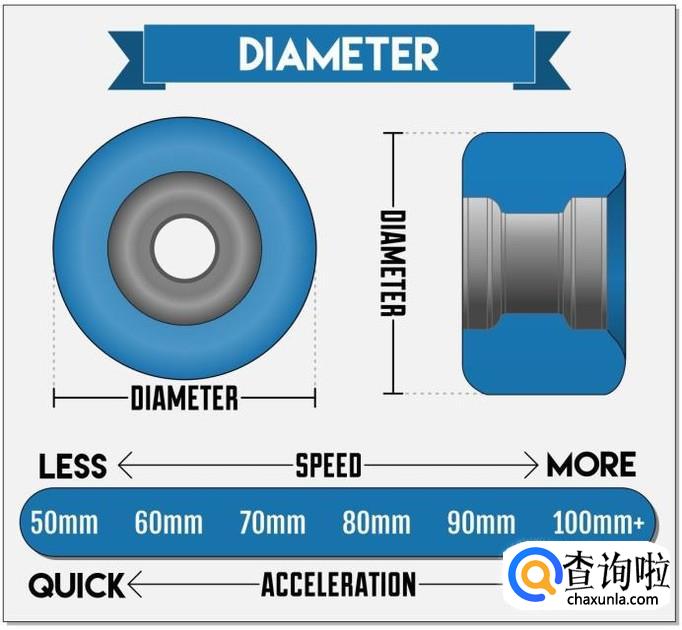 轮子的直径,轮子直径以毫米计算,直径越大滑行时越平稳,同时意味着轮子更重,提速就更慢,理想的直径在70mm-80mm之间,这时滑板兼具轻便与快速