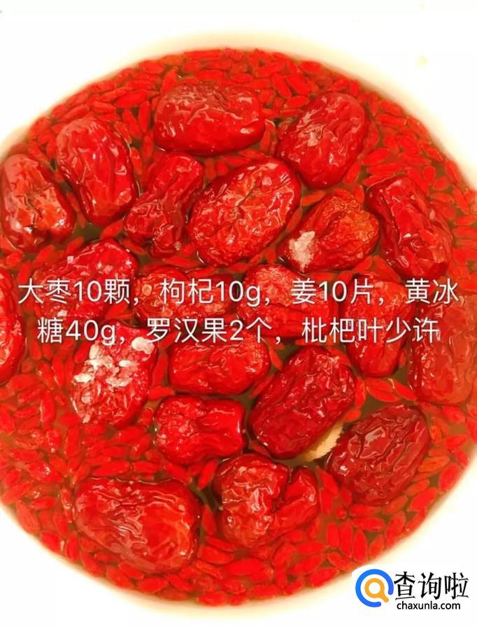 然后在果汁中加入十颗大枣,枸杞十克,姜十片,黄糖是十克,罗汉果两克,枇杷叶少许,如下图所示。