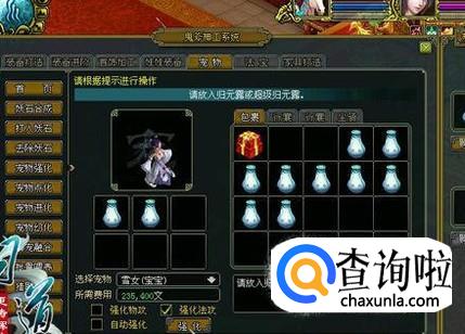 在这个新版中,强化采用宠物强化丹(图片里有),归元露这种类似于神仙水的物品,进行强化,其中超级归元露的效果更是高于普通的,可为是大补之物。