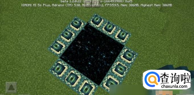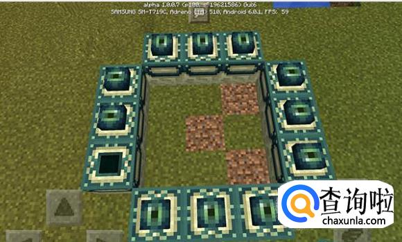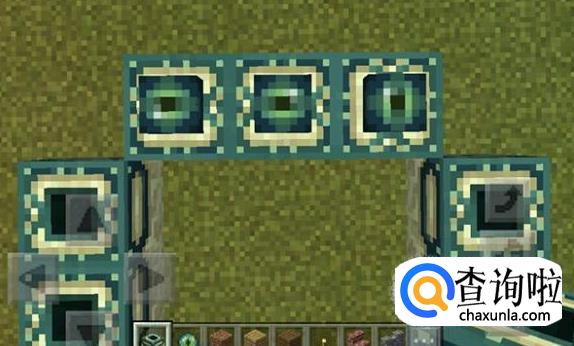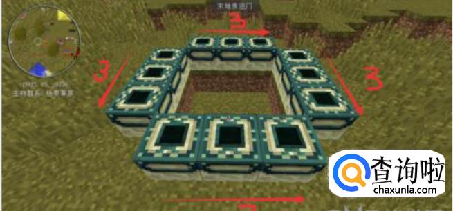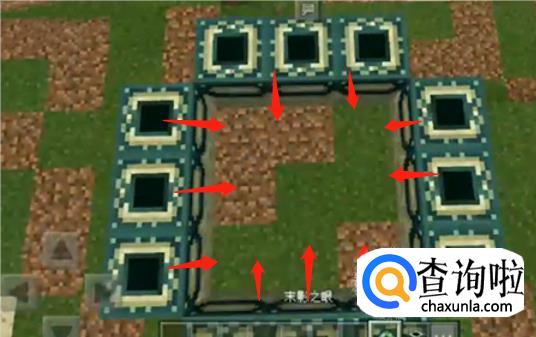 然后我们进入这个3*3的坑中,在这个坑中的边沿上摆放末地传送门,四个方向上各三个,注意,玩家必须全程站在这个3*3的坑里摆放末地传送门,否则激活不了,激活不了!激活不了!!重要事情说三遍。