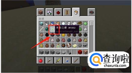 先按E键找到末地传送门还有末影之眼,末地传送门在装饰性方块那个选项中,就是牡丹花那个;末影之眼在杂项也就是岩浆桶那个选项中。