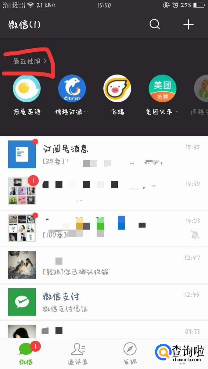 下滑微信聊天界面,找到小程序上方的最近使用,点击即可。