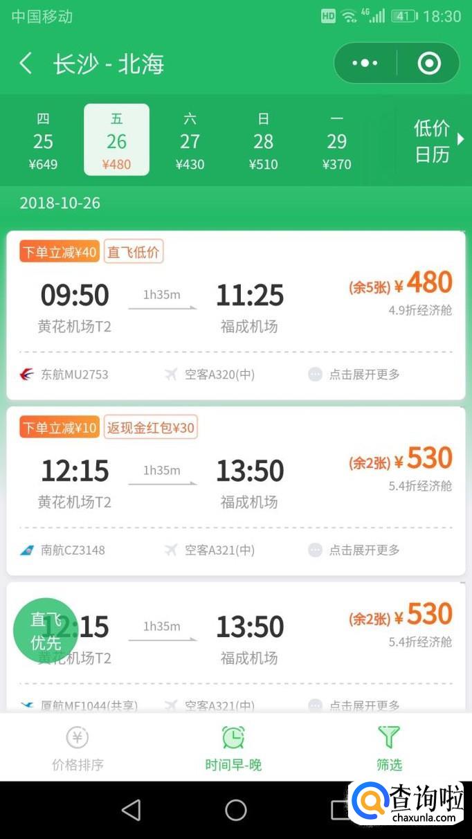 进入查询后,可以看到航班机票的相关信息,点击右上角的“低价日历”进入。