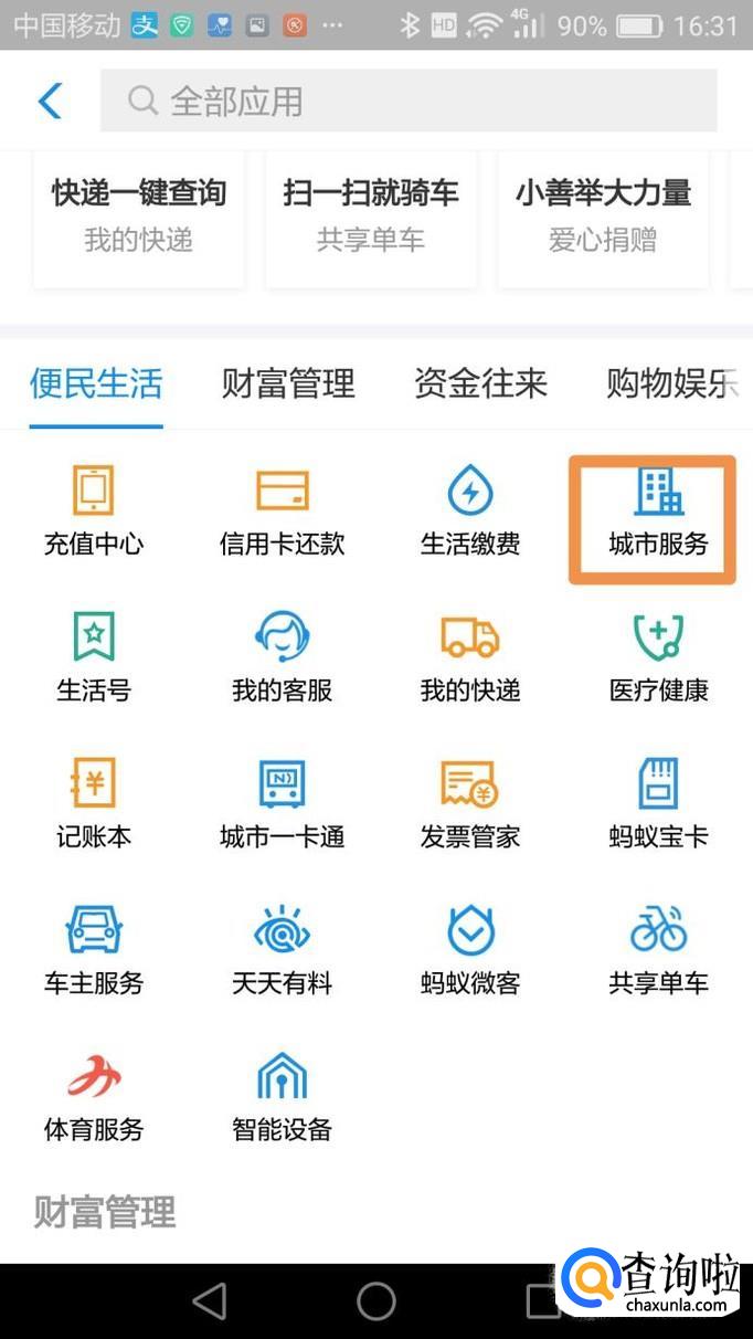 打开手机支付宝,在首页点击“更多”,进去之后点击便民生活中的“城市服务”。