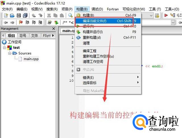 接下来点击顶部的构建菜单,选择编译当前文件选项,如下图所示