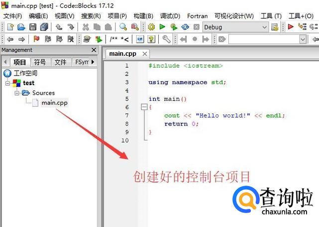 然后回到Code Blocks界面中,我们就可以看到左侧创建好了控制台项目了,打开main.cpp文件,里面已经默认编写了C++基本代码,如下图所示