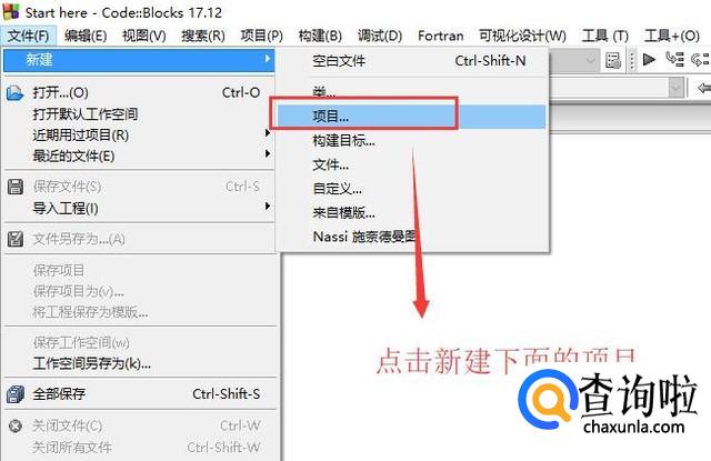 打开Code Blocks软件,点击左上角的文件菜单,然后选择新建下面的项目选项,如下图所示