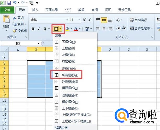 然后我们点击边框按钮边上的下拉箭头,弹出的界面,我们点击所有边框;