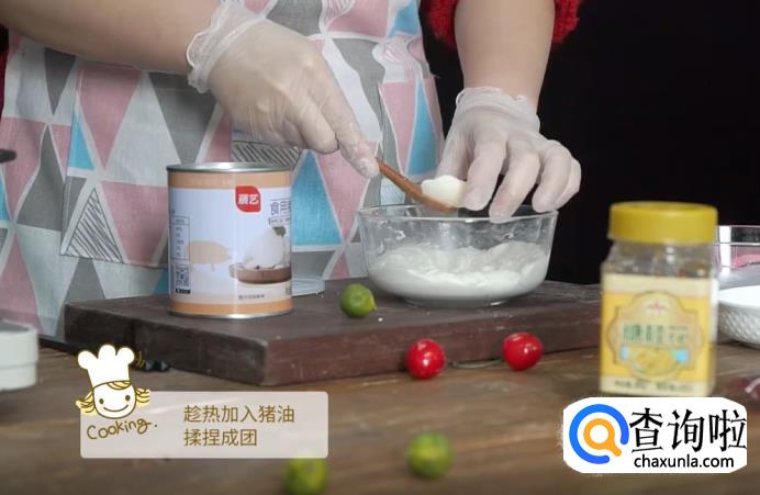 趁着温度还没有降下去,把准备好的猪油放入粉中,一起揉捏成团。