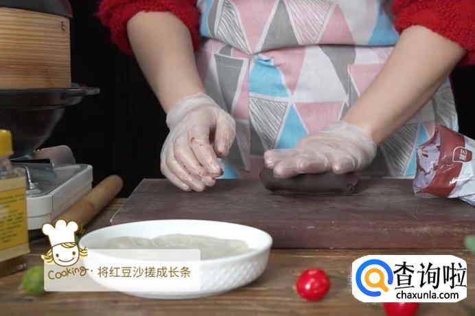接下来,将红豆沙揉搓成长条状。
