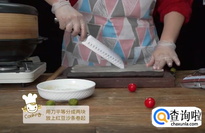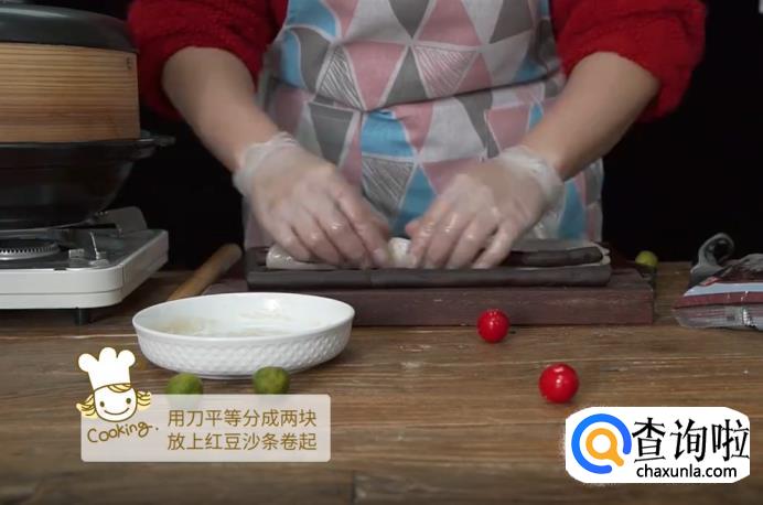 擀开之后,用刀将面皮平等地分成两块,然后将搓好的红豆沙分别放在面皮上,卷起来。