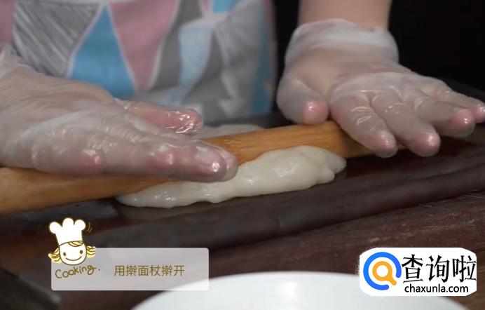 等糯米团温度变得和手的温度差不多的时候,把它从容器中取出来,揉捏一会,然后用擀面杖将糯米团擀开。