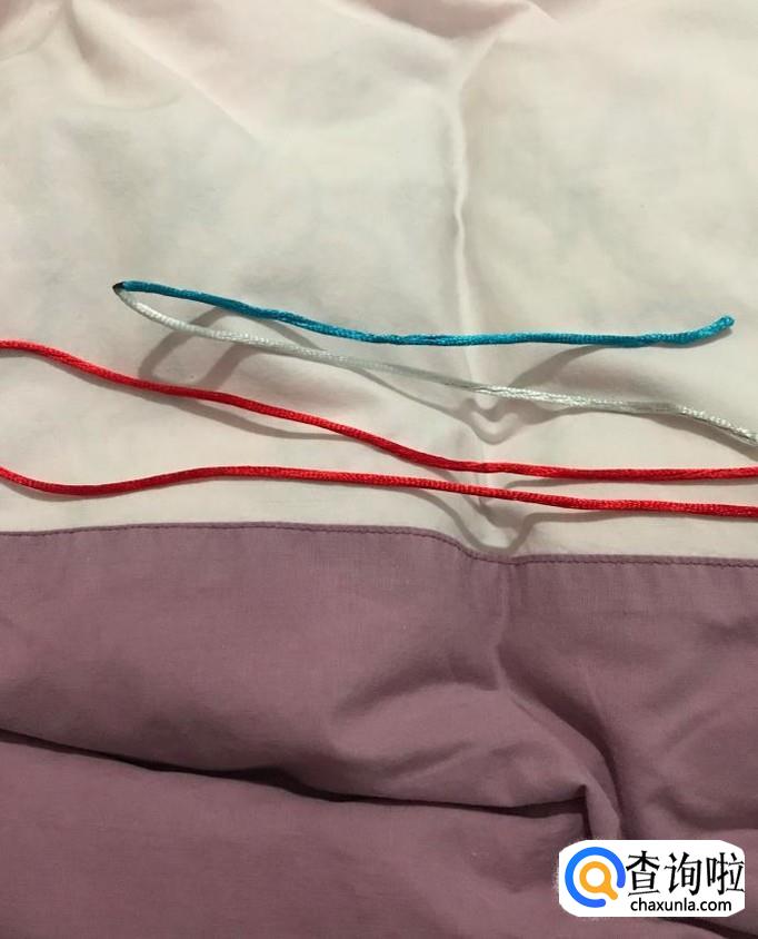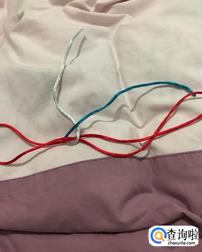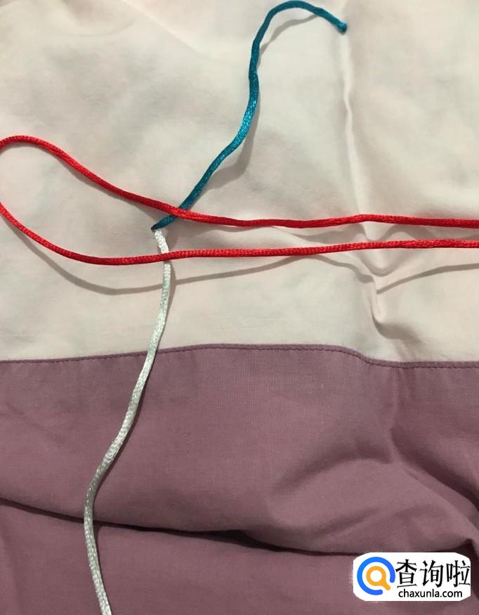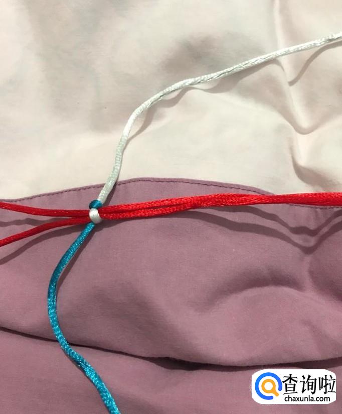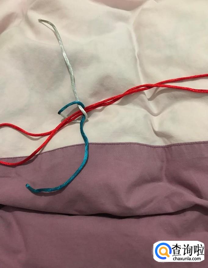 接下来,重复以上步骤,银线拉到上方,蓝线压住后绕到红线后面,从下方银线圈中穿出,调整、拉紧。
