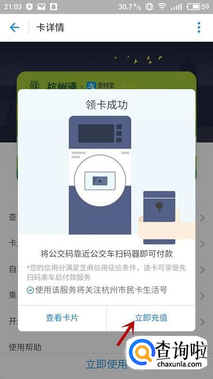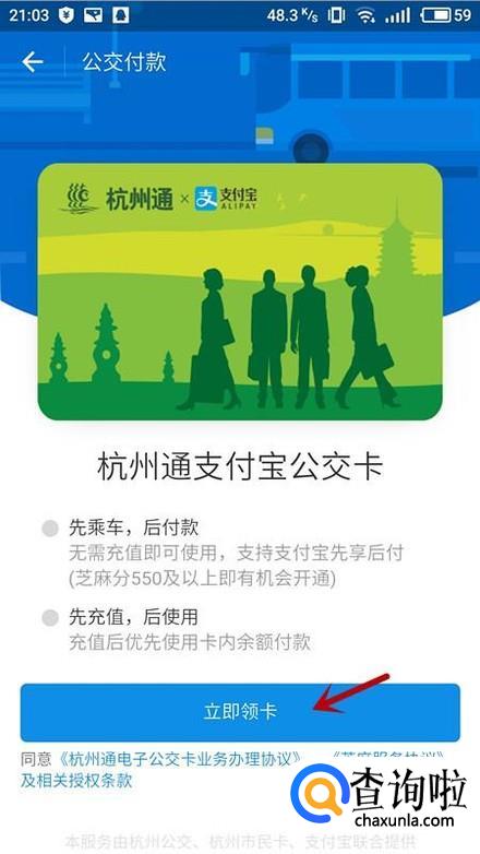 进入公交付款界面,选择“立即领卡”