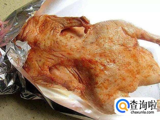 准备一只整鸭,将鸭子洗净,鸭脚、鸭头切掉,用盐将鸭子全身都擦一遍,然后将酱油、八角、花椒、姜、盐、料酒、桂皮放入,涂抹均匀,放到冰箱里腌制24小时。