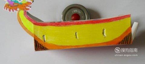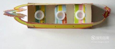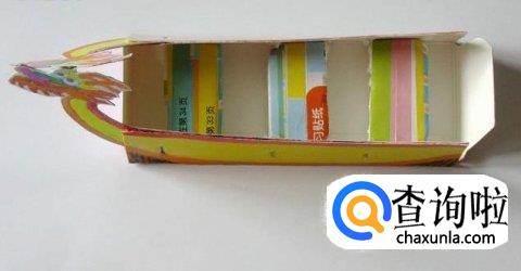 给船身涂色,将龙头和龙尾粘贴到纸盒上,然后将两边龙头、龙尾相粘,一定要粘牢固,这样更加龙舟不容易散架。