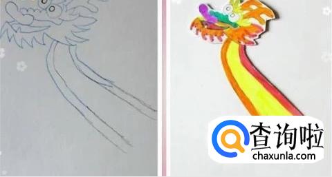 在硬纸上画出龙头和龙尾,上色,并用剪刀剪下来。