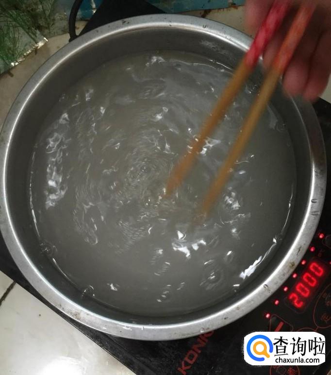 然后在锅里按一比四比例先加水,也就是一份淀粉四份水,放好后加入刚调好的淀粉溶液,开火煮粉就行,要一直用筷子搅拌防止糊锅,直到都成团并看起来透亮就好了。